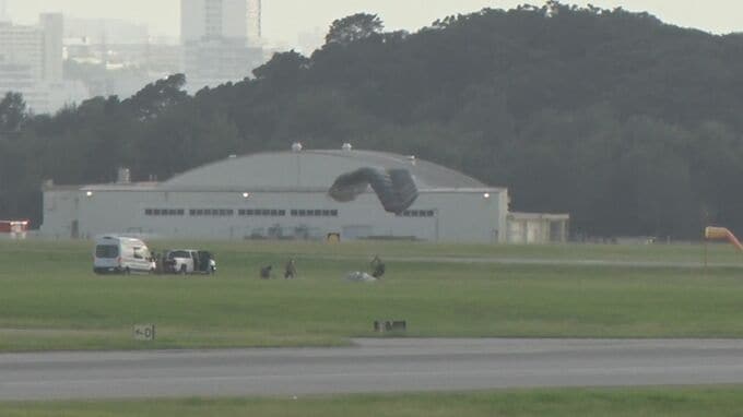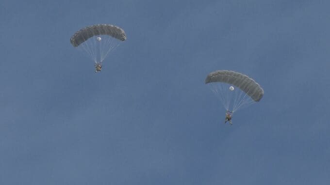 そして上空を旋回しおよそ40分後、兵士が次々とパラシュートで降下し訓練が強行されました。