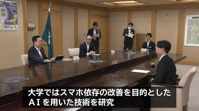 小原さんが大学で研究するのは、スマホ依存の改善を目的としたAIを用いた技術で、24日は達増知事に研究の状況を報告しました。