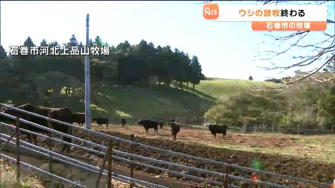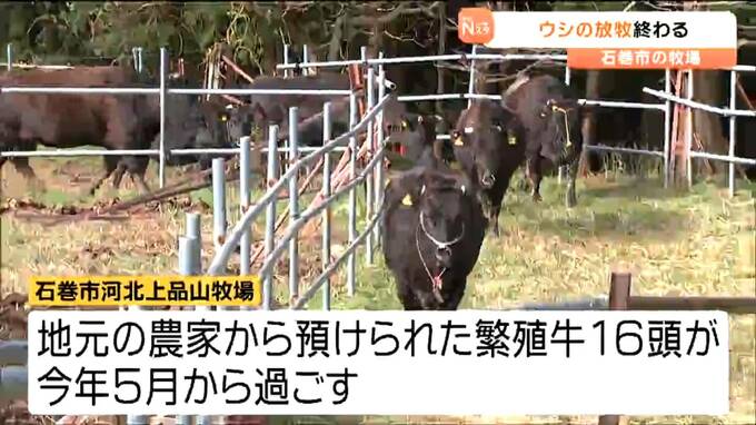 放牧を終えたのは、標高467メートルの山の頂上にある「石巻市河北上品山牧場」です。地元の農家から預けられた繁殖牛16頭が、2025年5月から過ごしてきました。