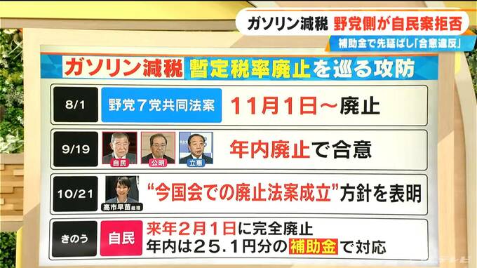 いろいろな準備が整わないということなんでしょうが、ただ自民党は、「年内は暫定税率と同額の25.1円の補助金を出すので、これは実質廃止ですよね」と言っているんです。