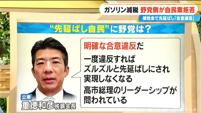 これに対してこの法案に関わってきた野党、立憲の重徳税調会長は、「同額の補助金で対応するからいいという話ではない。明確な合意違反だ。一度違反すれば、ズルズルと先延ばしされ、実現しなくなる。高市総理のリーダーシップが問われる」と徹底抗戦の構えです。