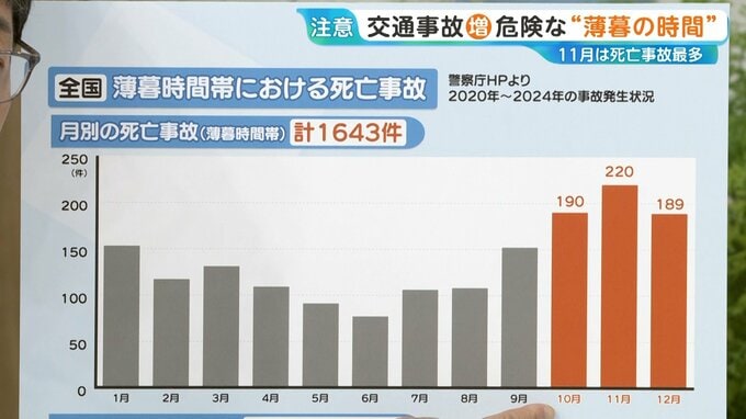 警視庁HPによると、薄暮時間帯における月別の死亡事故の件数は、11月が最多となっています。