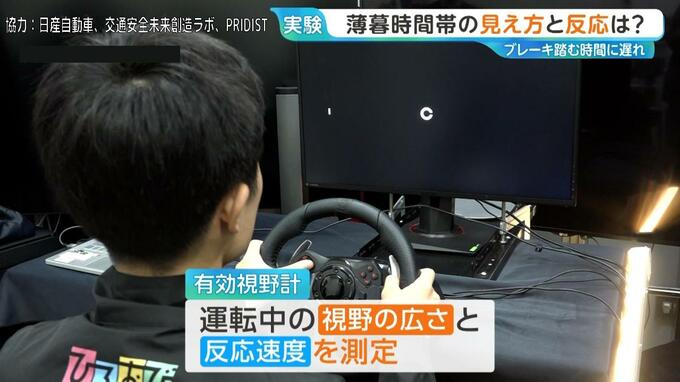 「薄暮」では、反応時間が1.24秒と約0.5秒遅くなりました。