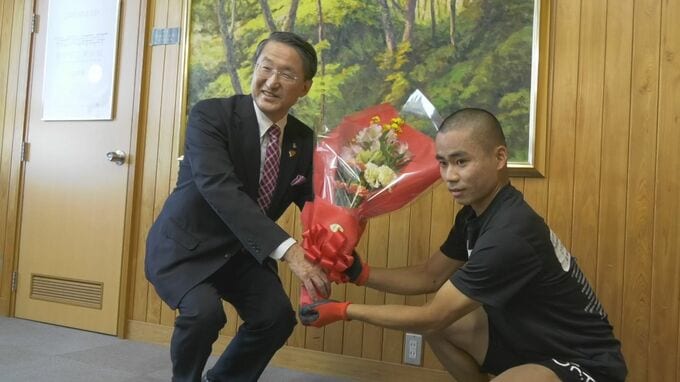 しゃがみながらの独特なポーズで平井知事から花束を受け取る男性。先月山陰を沸かせた米江龍星さん(23)です。
