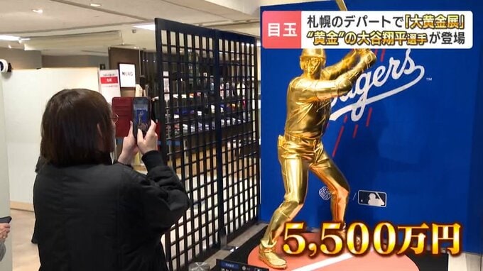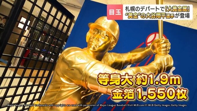 「黄金の像となって札幌の地に凱旋したのは…大谷翔平選手です!なんと等身大1.9m。金箔は1550枚使われて、体の厚みもリアルに感じることができます」