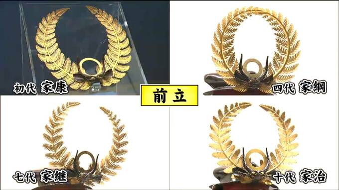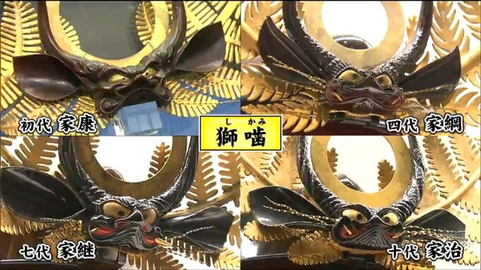 「今回の展示では、家康をはじめ四領の歯朶具足を展示している。それの前立、シダの葉っぱ、獅噛(しかみ)という空想上の動物の飾りをよくみると、顔や葉っぱの形、葉っぱの枚数が違っています」