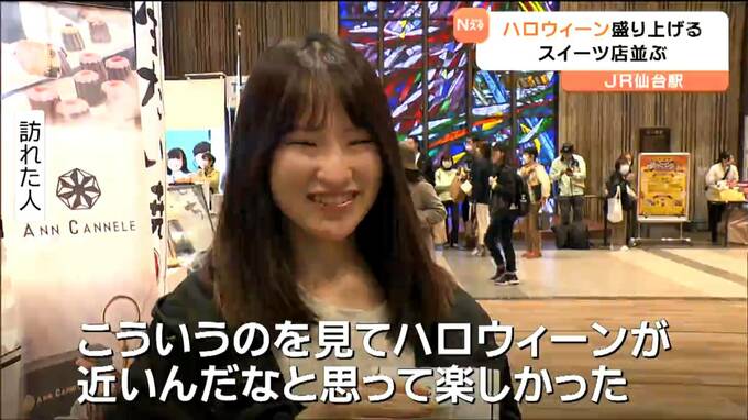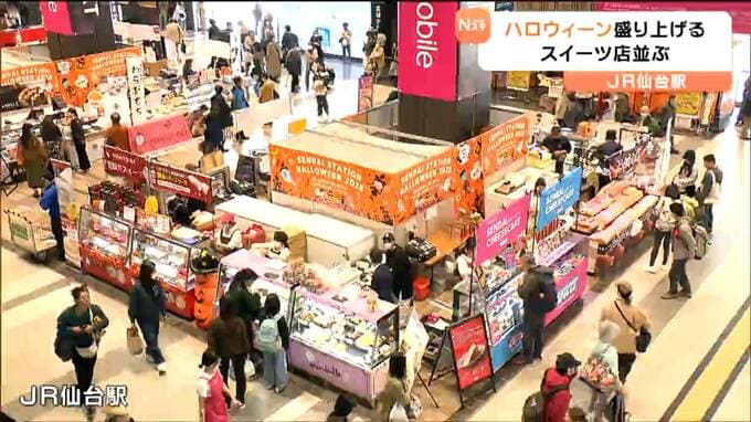 JR仙台駅2階で10月24日から始まったイベントには、宮城県内外の12のスイーツ店が出店しています。会場にはおばけがデザインされたケーキなどが並び、ハロウィーンのムードを盛り上げています。