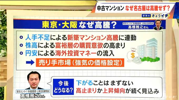 理由は主に3つあります。まず①人手不足による新築マンション高騰に連動ということで、新築が高くなれば、それに中古も引っ張られる傾向にあるんですね。次に②株高です。これは簡単に言うと、株で一儲けできるような一部のお金持ちの購買意欲の高まりということで、住み替えるというよりも、ほぼ投機目的で中古マンションに“買い”が集中している。さらに③円安です。外国人が「日本は安い」と、海外からの投資マネーの流入もあります。