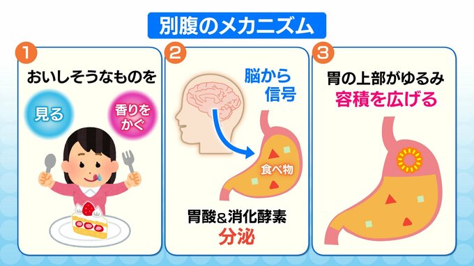 「こうしたことから、“別腹”は脳から胃への信号で作られる「準備スペース」であり、実際に存在するとも言えます」