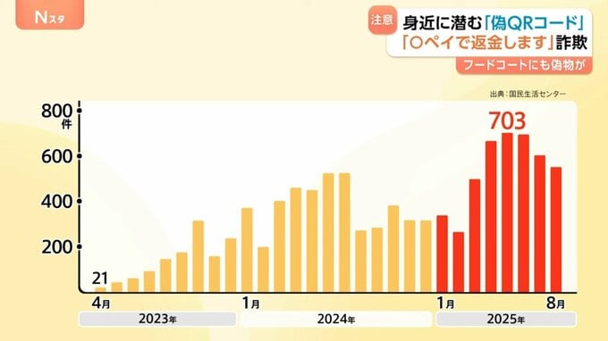 国民生活センターによると、近年、相談件数が急増しているのが「〇〇ペイで返金します」と騙る、偽QRコードの詐欺。