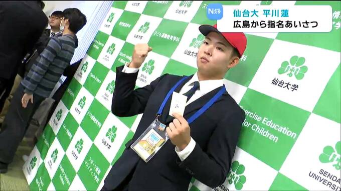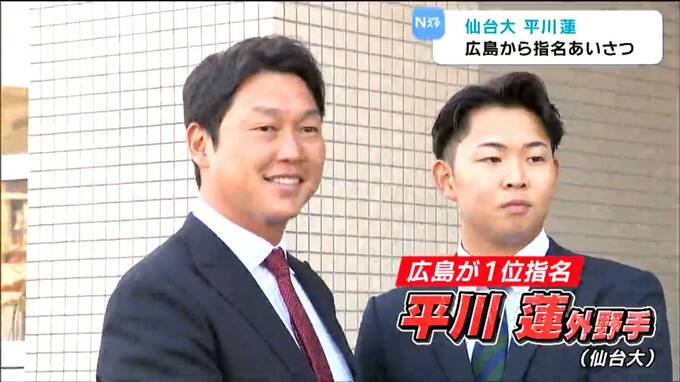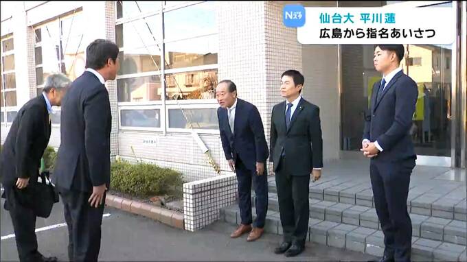 仙台大学を訪れたのはプロ野球・広島東洋カープの新井貴浩監督。10月23日夜のドラフトで1位指名した平川蓮外野手に指名挨拶を行いました。