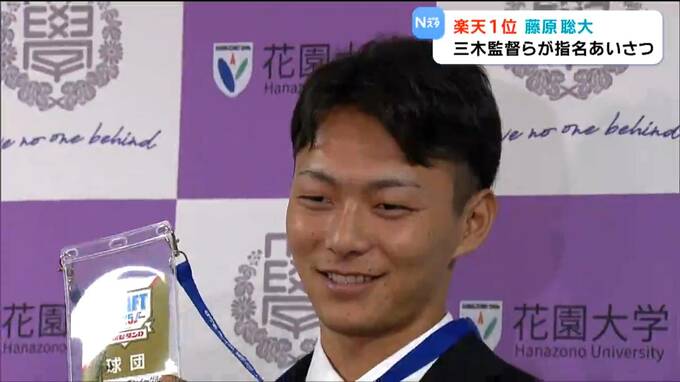 また、京都では楽天の三木監督らが1位指名した花園大・藤原聡大投手に指名挨拶を行いました。