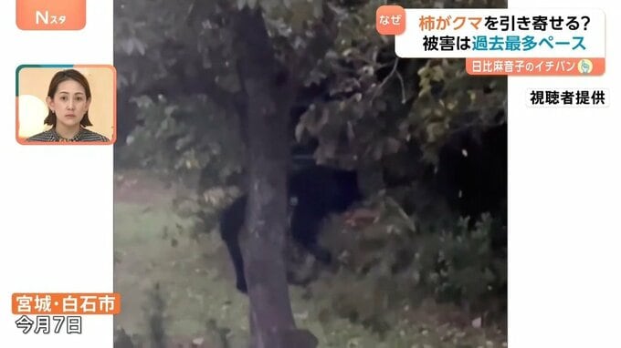 10月7日、宮城県・白石市で撮られた映像では、クマが民家の庭にある柿の木に登っています。実は前日にもクマが現れており、2日連続の出来事だったそうです。