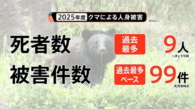 環境省によると、24日午前の時点でクマによる死者数は過去最多の9人。被害件数は9月末の時点で99件と、過去最多ペースです。