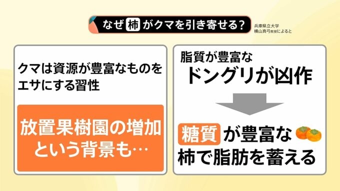 さらに、脂質が豊富なドングリが凶作ななか、クマは糖質が豊富な柿を食べることによって脂肪を蓄えているのではないかという分析もあります。