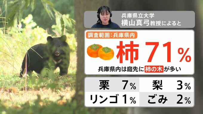 兵庫県立大学の横山真弓教授によると、兵庫県内での調査では栗が7%、梨が3%、リンゴが1%、ごみが2%となっているなか、突出して多かったのは柿で71%でした。