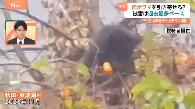 そして、2023年に秋田県の東成瀬村で撮られた映像でも、クマが柿の実を食べている様子がわかります。このあと山のほうへ逃げていったということですが、東成瀬村では24日、新たなクマの被害が明らかになりました。