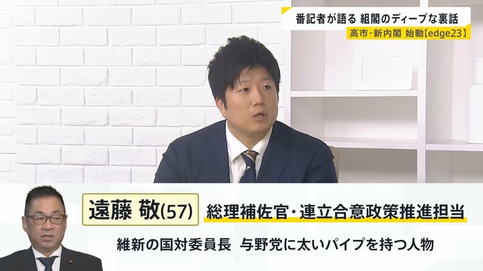 注目なのが、新たに総理補佐官に就任した維新の遠藤敬氏だ。「連立合意政策推進担当」として両党の調整役を担うことになる。衆参両院で少数与党のため、国会運営や政策を実現するうえで野党の協力が欠かせない現状で、与野党に太いパイプを持つ遠藤氏の存在は、今後の政権運営でも重要な役割を果たすことになると思われる。