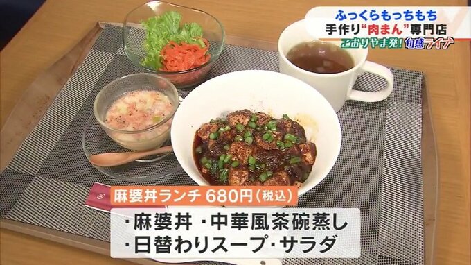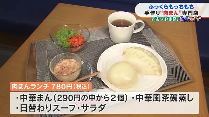 肉まんランチは、290円のものの中から好きな中華まんを2個選べて、中華風茶碗蒸しと日替わりスープにサラダ付きで780円とリーズナブル。