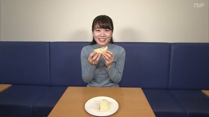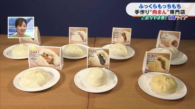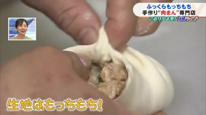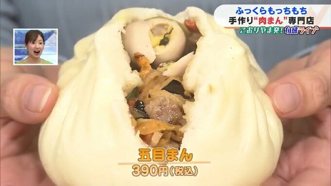 安部遼アナウンサー「ほっかほかの肉まんです!湯気が出ていておいしそうですね!いただきます!生地が想像以上にもっちもちです。そしてかんだ瞬間に肉汁があふれてきて、ジューシーさがたまりません!おいしいです」