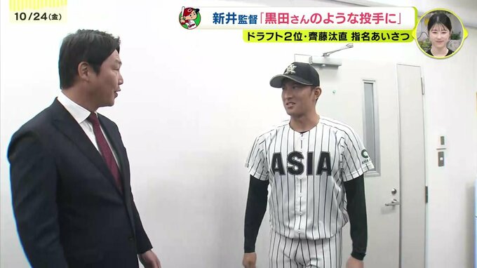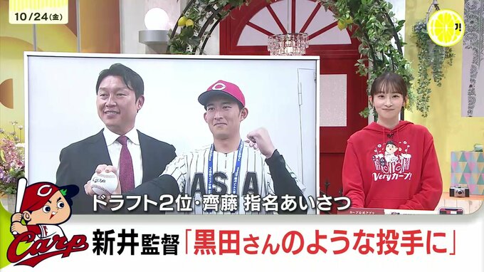 新井監督は「1年目から即戦力として期待している。ゆくゆくはチームを背負って投げることのできる黒田さんのようなピッチャーになってほしい」と期待を込めました。