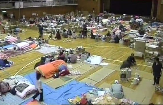 当時の避難所の様子を見ると、広い体育館にたくさんの人が生活し、仕切りなどはあまりありません。