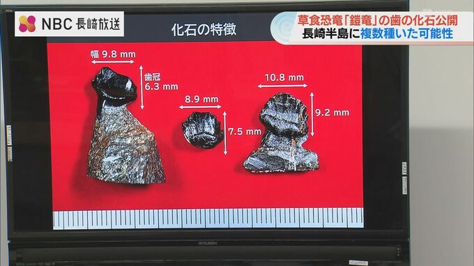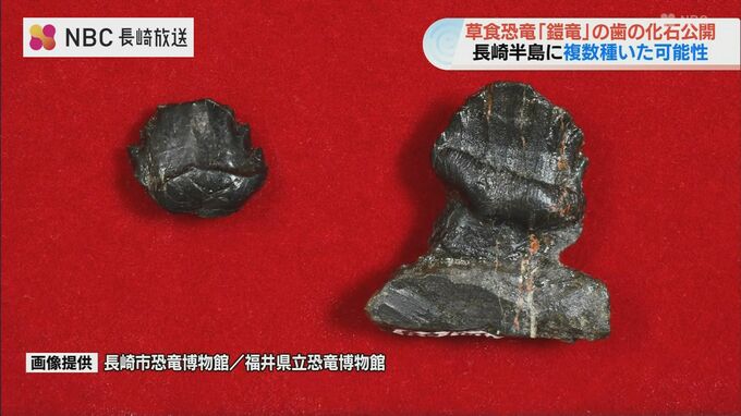 新たに公開されたのは、「鎧竜」といわれる草食恐竜の歯の化石2点です。長崎半島の西海岸などで発掘調査を行っている長崎市恐竜博物館と福井県の研究グループが発見しました。