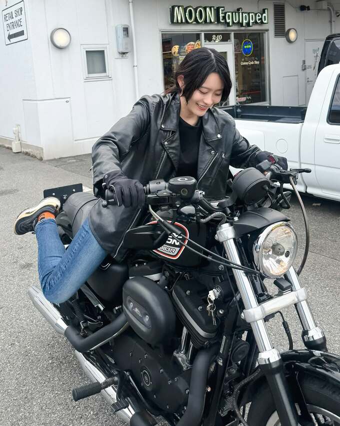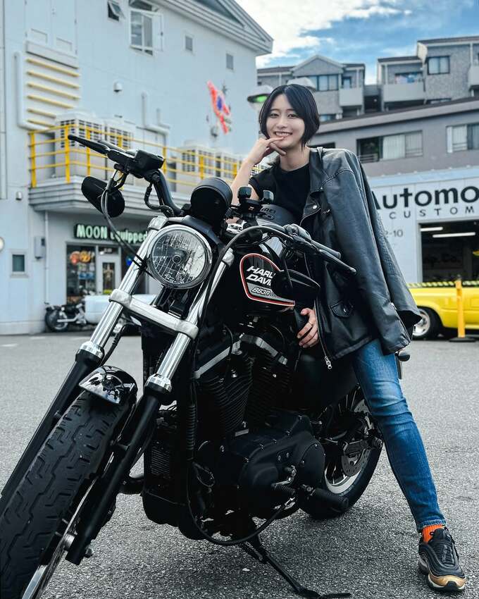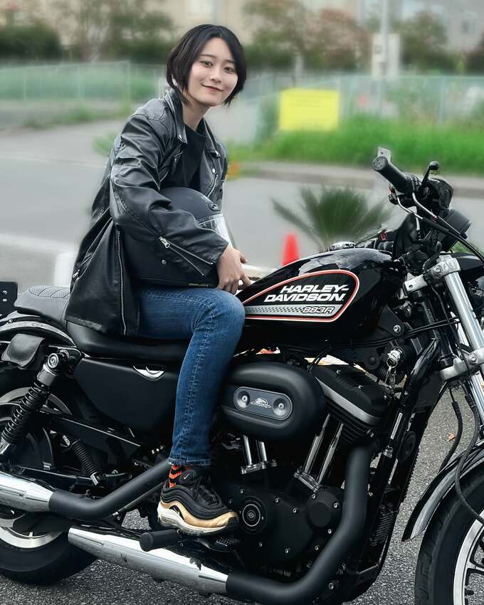 彩雪さんは「XL883Rが相棒になってからもう半年くらい経ちました」とテキスト。黒のライダーズコートを肩に掛け、デニムの脚を路面に伸ばして愛車ハーレー・ダビッドソンXL883Rに跨がってポーズを取っています。