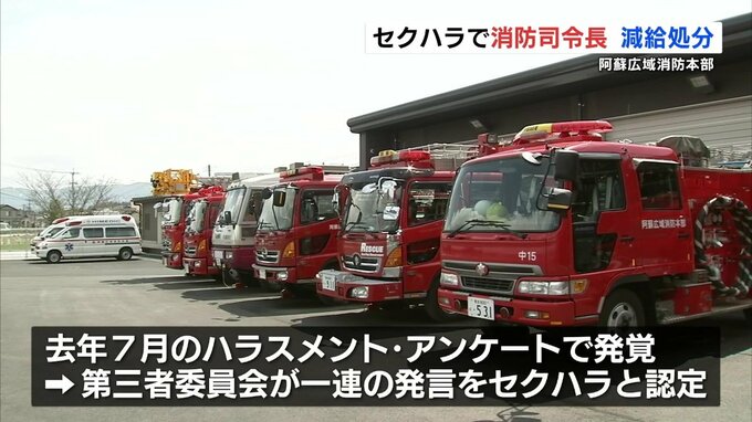 阿蘇広域消防本部の50代の男性消防司令長が、複数の部下の女性にセクハラ行為をしたとして、24日付けで減給処分を受けました。減給処分を受けたのは、阿蘇広域消防本部の53歳の男性消防司令長です。阿蘇広域消防本…