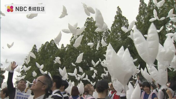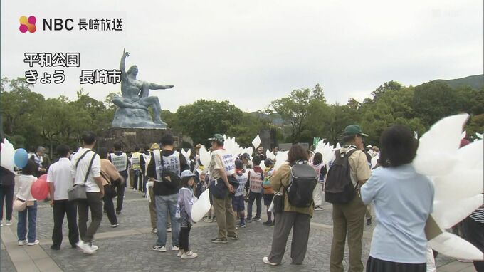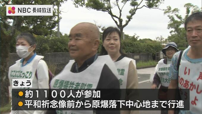 平和祈念像前から爆心地公園までを、参加した被爆者や学生ら約1,100人が、平和のメッセージが書かれたビブスを着用し、行進しました。