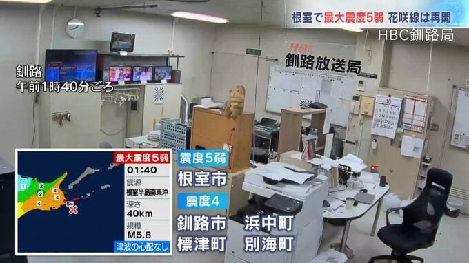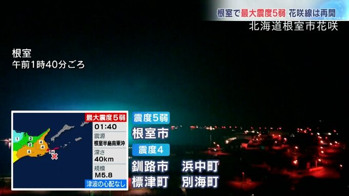 25日午前1時40分ごろ、根室市で震度5弱、釧路市などで震度4を観測する地震がありました。
