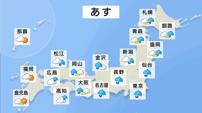 あすは低気圧や前線の影響で、広い範囲で雨となりそうです。東海や関東、北陸、東北南部は、午後ほど、雨足の強まる所があるでしょう。北海道は朝のうち晴れ間がありますが、夕方以降は激しい雨になる所があり、沿…