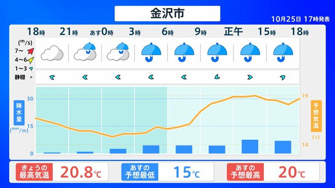 金沢では26日は未明から雨の降る天気になるでしょう。