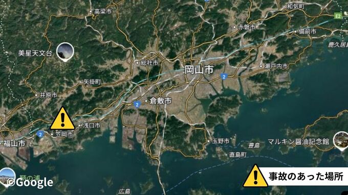 きょう午前0時10分頃笠岡市園井の山陽自動車道の上り線【画像①】を走っていた中型トラックが、中央分離帯に接触したあと弾みで道路左側の法面に衝突しました。