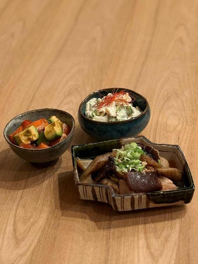 また別の写真では、複数の小皿に盛られた料理が確認できます。鶏ごぼうの煮物や鮪サーモンアボカドの漬け、胡瓜と大根のサラダなど、和食の繊細な盛り付けが特徴的です。