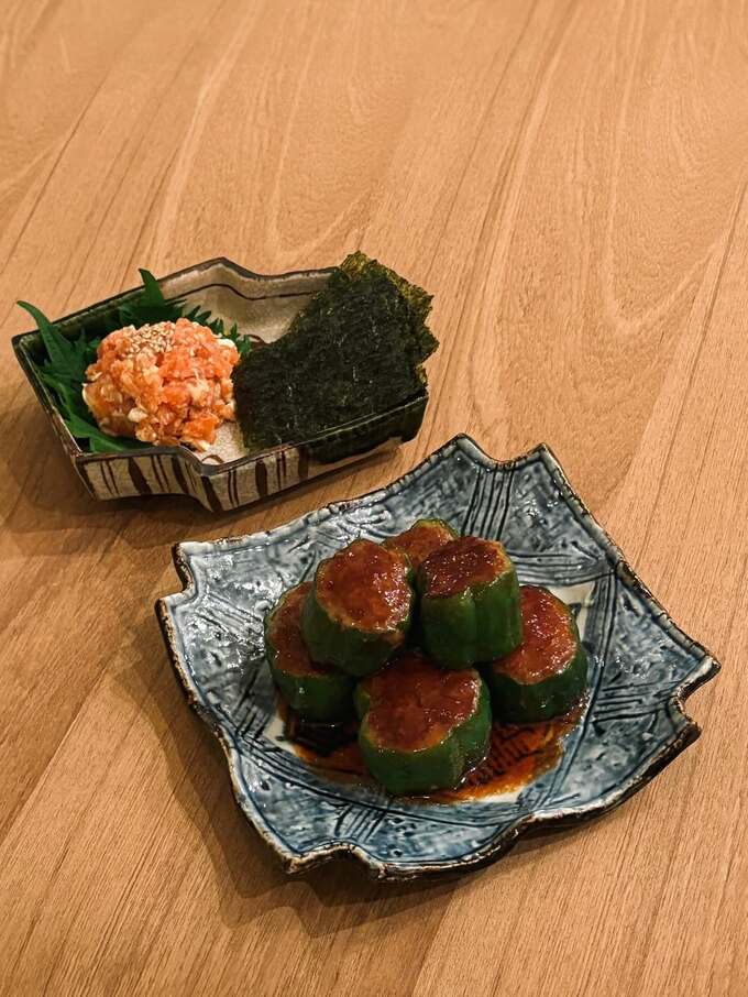 さらにピーマンの肉詰めと海苔を添えたクリームチーズサーモンタルタルの写真も投稿しています