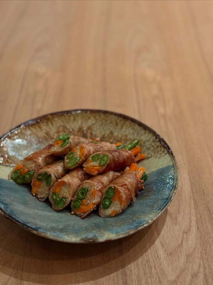投稿された写真には、木製のテーブルの上に並べられた和風の料理が写っています。豚肉で野菜を巻いたロール状の一品は、断面からにんじんのオレンジといんげんの緑が覗き、香ばしく焼かれた豚肉が食欲をそそります。