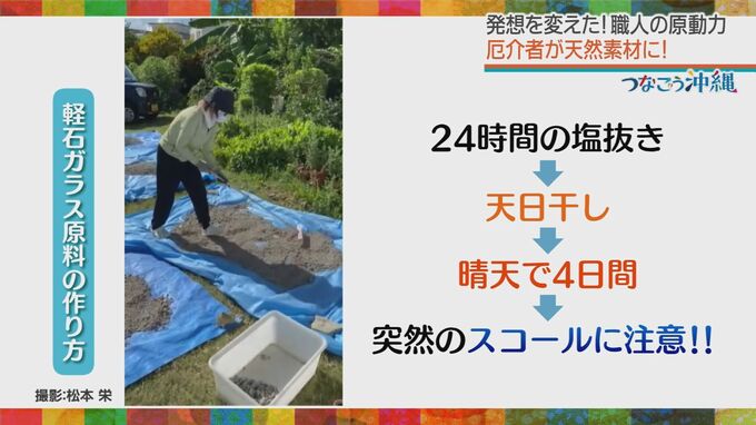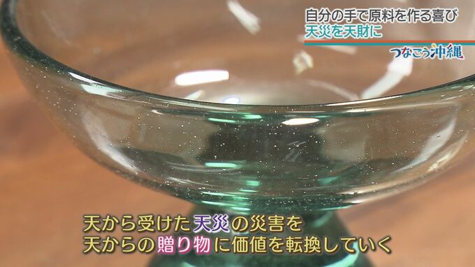 「普段使ってる廃ビンの透明なガラスと、この軽石のガラス。これを二つを一つにして、琉球ガラスの製品を作っていきたい今一見うまくいってるようなんですけどまだ少しこうやって膨張率っていうのが合わなくて割れてしまったりとかもしてるのでこれから自分が作る作品の中に軽石のガラスを琉球ガラスの一つの色として取り込んで行けるようになるんじゃないかなと言う所まで来ています。もうすぐです」