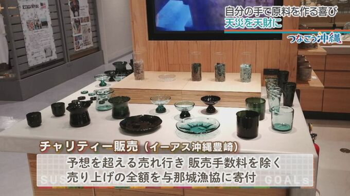 製品が出来ればあとは売るだけ。松本さんの取り組みに共感した仲間たちに軽石ガラスの原料を提供。制作を依頼し、被害をうけた漁協の皆さんの足しになればとチャリティーの展示即売会を開きました。会場を訪れた人の驚きと関心は高く、予想を超える売れ行きで、販売手数料を除いた売り上げの全てが、軽石を提供してくれた松本さんの地元、与那城漁協へ寄付されました。