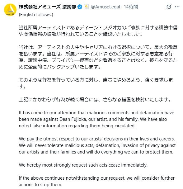 フジオカさんの所属事務所「アミューズ」法務部の公式Xアカウントでは「当社所属アーティストであるディーン・フジオカのご家族に対する誹謗中傷や虚偽情報の拡散が行われていることを確認いたしました」と公表。所属するアーティストと家族を「守るために全面的にバックアップいたします」と宣言し、警告を発しています。