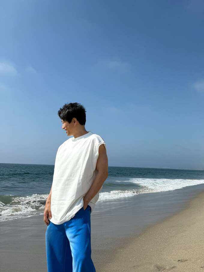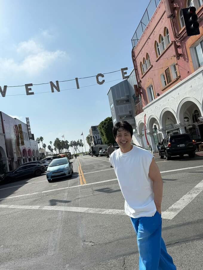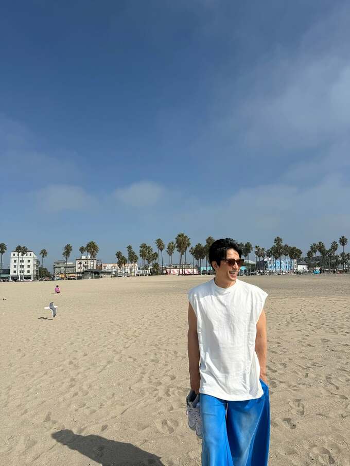 サングラスを掛けて砂浜を歩く写真では、背後にパームツリーが立ち並んでいるのが見えています。5枚目の写真では大通りにサインが掲げられており、一連の写真は米・LAの「ベニスビーチ」近辺で撮影されたものとみられます。