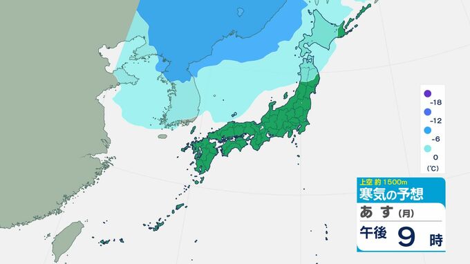 「月曜日~火曜日は、冬型の気圧配置が強まる見込みです。北からはこの時季としては強い平地で雪を降らす目安の寒気が北海道に流れ込むでしょう【画像⑨】」