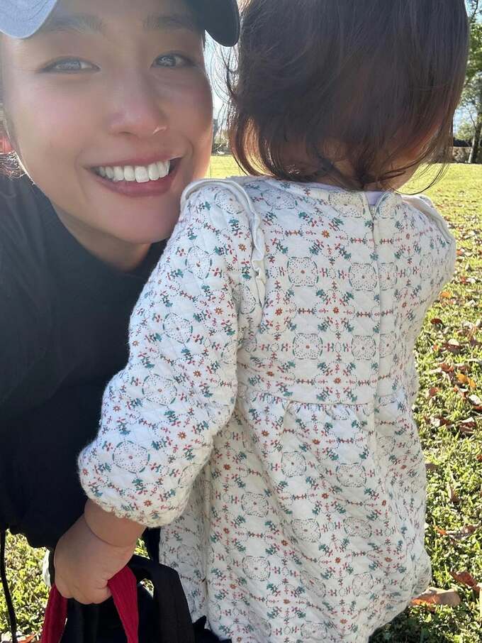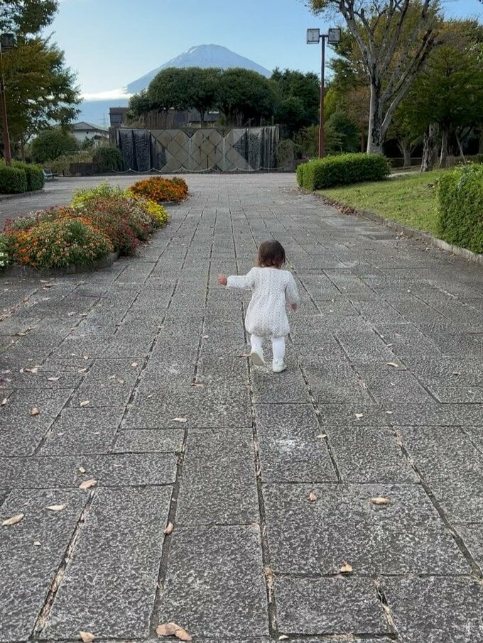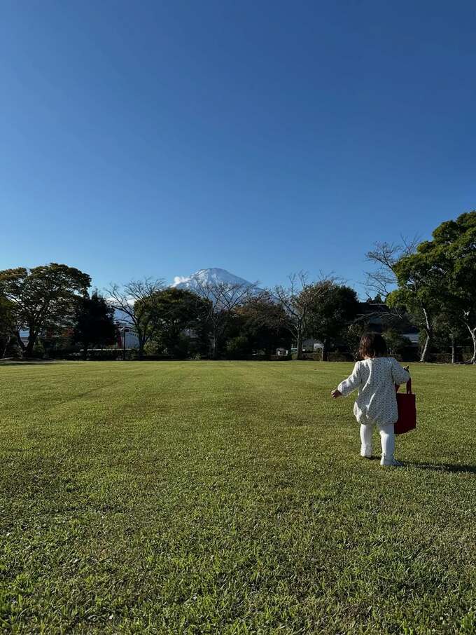 写真には1歳5か月の娘の姿も。公園の石畳や芝生を歩く様子が複数枚投稿されており、親子で富士山を望む景色を楽しんだ様子が伝わってきます。