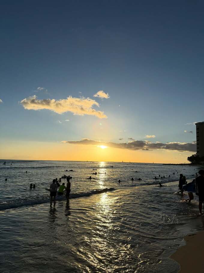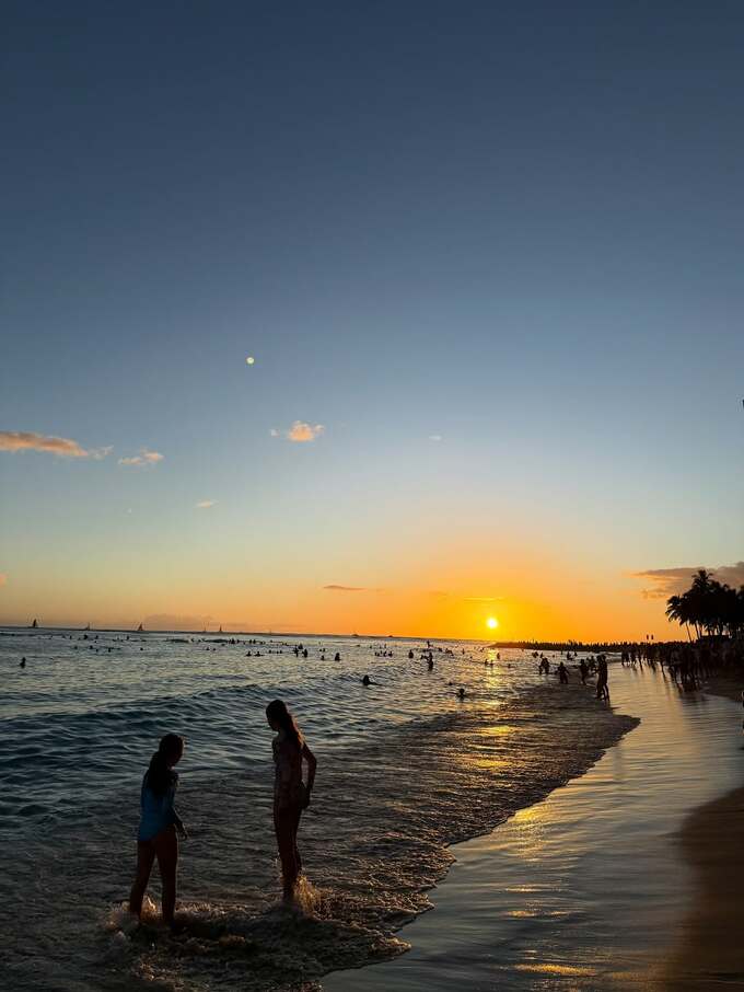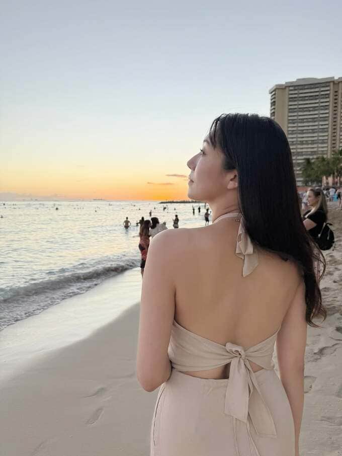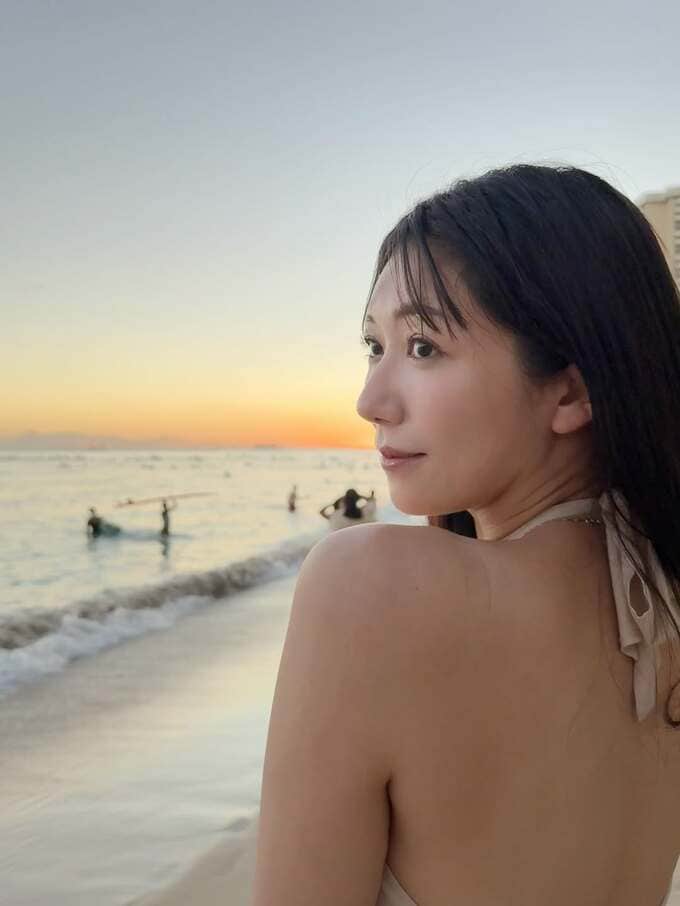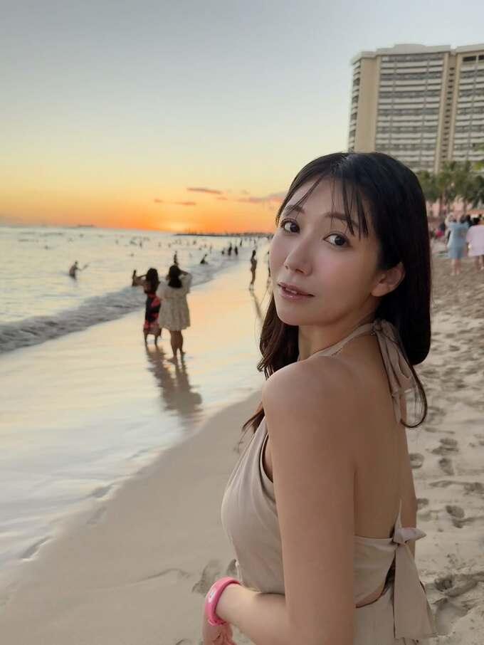 投稿では、ベージュのトップスを着用した穂川さん自身がビーチに立つ姿や、夕暮れ時のワイキキビーチで遊ぶ人々の様子が写し出されています。