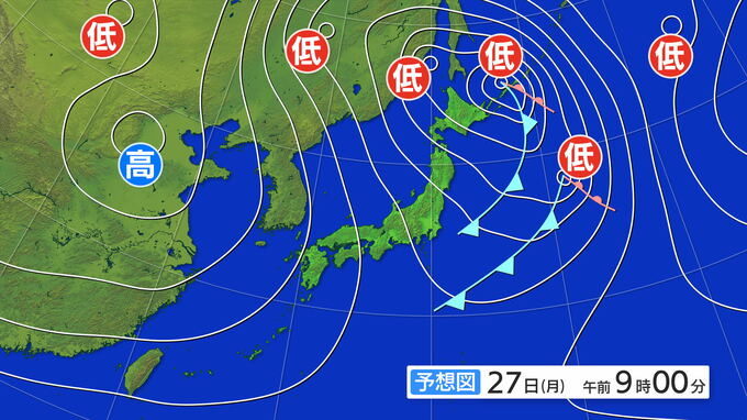 27日午前9時の予想天気図です。大陸に高気圧が、千島付近や日本の東の海上に前線をともなった低気圧があります。