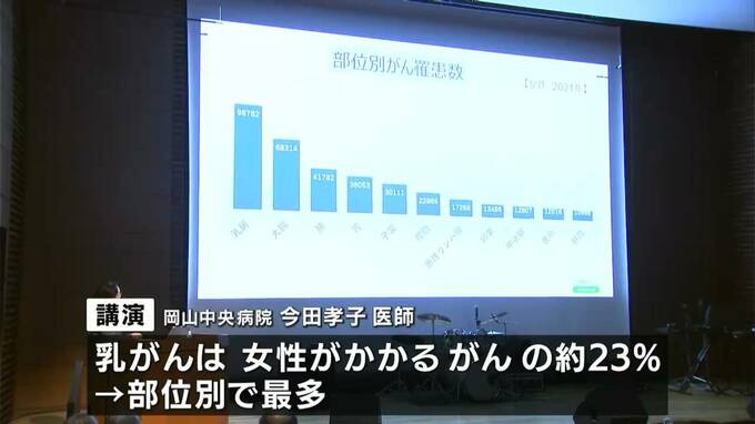 はじめに、岡山中央病院の医師が講演を行い、乳がんは女性がかかるがんのうち約23%を占め部位別で最多であることや、早期の発見によって治療の選択肢が増えるため検診の定期的な受診が大切であることなどを伝えました。