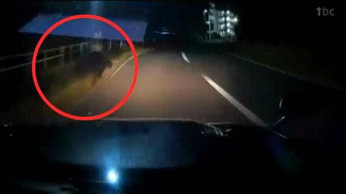 市道を走る一台の車。次の瞬間、画面左から飛び出してきた動物と衝突しました。