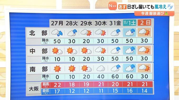10月27日(月)の近畿地方は風冷えとなるでしょう。北風がひんやりと感じられそうです。 日本付近は冬型の気圧配置となり、北からはこの時期にしては強い寒気が流れ込んでくるでしょう。北よりの風が強まり、…