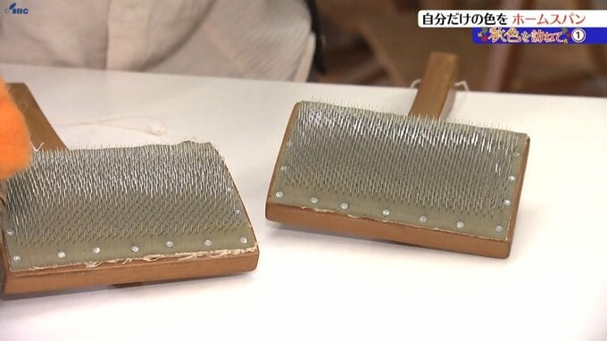手でちぎってざっくり混ぜた後は、ハンドカーダーと呼ばれる剣山のような道具を使って髪の毛を梳くように混ぜ合わせていきます。