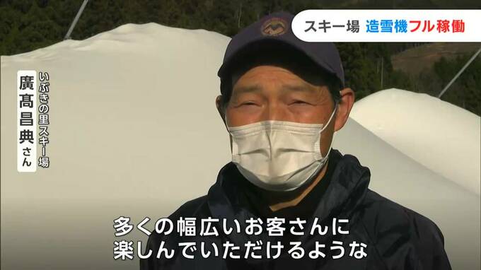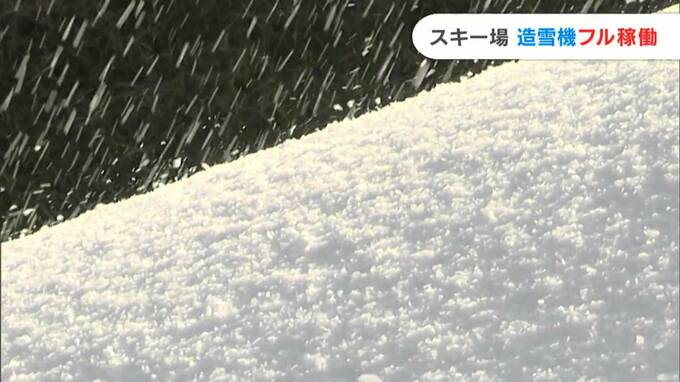 造雪機を24時間フル稼働させ、1日で約240トンの雪を作り出しています。造雪作業は12月3日から始まり、これまでにオープンに必要な量の3割程度がたまりました。